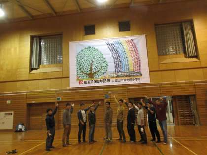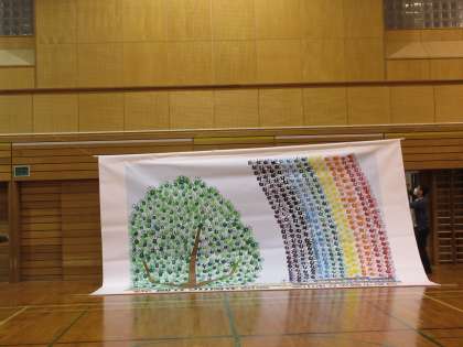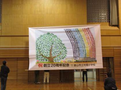 創立20年記念制作 みんなの手型で描いた壁画が、体育館に掲げられました。大きな壁画を体育館の天井近くまで吊り上げ、見事に収まりました。おとうさんたちの力って偉大ですね。明日から、この壁画を見上げながら、ますます夢や希望にまっしぐらな光陽っ子になりましょう。おと会の皆様、ありがとうございました。