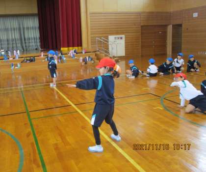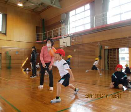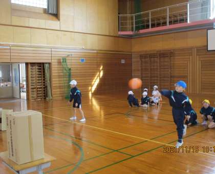 1年生の体育では、ボール投げ運動を行っています。今日は、久しぶりに学年で体育を行いました。「1,2,3」の掛け声で、段ボールの的に向かって思い切り投げます。練習を重ねるうちに、手のひらにボールがのるようになり、的に向かって思い切り投げることができるようになってきました。