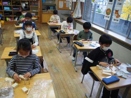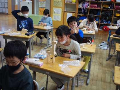図画工作科「くぎうちトントン」の学習で、設計図を作りました。子供たちは、木片を動かしたり、重ねたりして、お気に入りの形を考えました。