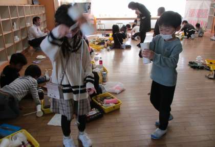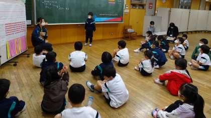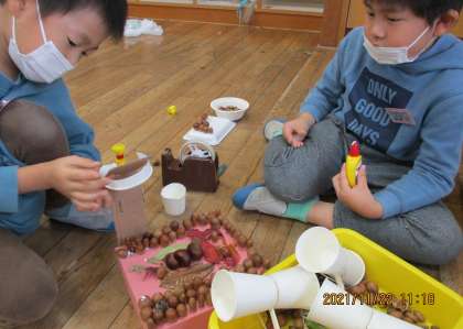 1年生は、10月下旬から「あきと なかよし」という学習を行っています。2組は「こんな物作りたいな」「こんなことをして遊びたいな」という願いや思いを、一人一人がもって活動に取り組んでいます。活動中は、友達が困っていると手伝ったり、一緒に遊んだり、自分の作りたい物をとことん作ったりする姿が見られます。どの子供も、楽しんで授業に取り組んでいます。