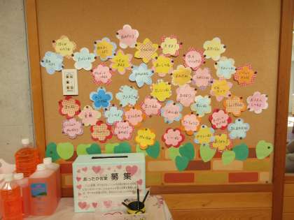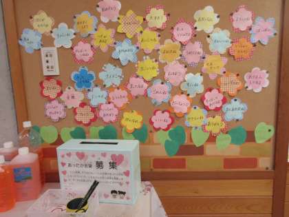 保健委員会では、心も体もあたたかくなる「あったか言葉」を募集して、「あったか言葉の花」を増やしています。いろいろな「あったか言葉」がありますね。この2週間で、寒さが増し、花壇の花は枯れてきましたが、心の花「あったか言葉の花」は、じわじわと増えてきました。