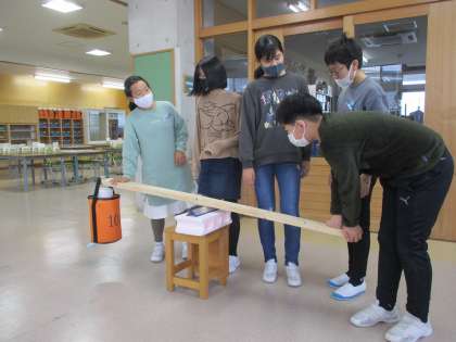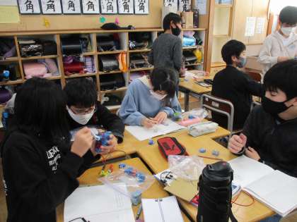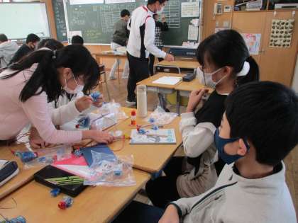 理科の学習の様子です。「電気と私たちのくらし」の学習では、手回し発電機で発電した電気に、電流の向きがあるかどうか確かめました。「てこのはたらき」の学習では、力点と作用点の位置を変え、おもりを持ち上げた時の手応えを調べました。どの学習でも、実験結果からどのようなことがいえるか考察し、まとめています。
