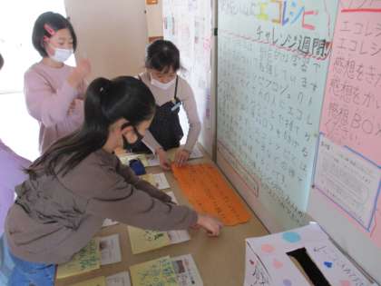 食品ロスゼロウィークの様子です。今日はさんさんタイムに1・6年生を対象に、手前取りを意識した買い物体験や、すごろく、クイズのイベントを開催しました。他にも、スタンプラリーやエコレシピチャレンジ週間なども開催中です!活動の後は、振り返りをし、反省点を次に生かそうとする姿がみられました。