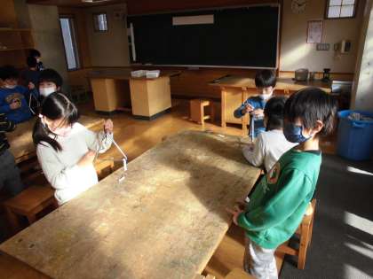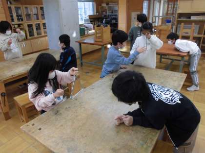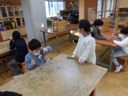 3年生の理科では音の学習をしています。楽器のトライアングルを使って、音が出ているときはどうなっているのかを実験しました。トライアングルの先に付けたふせんがふるえているのを見て、音が出るときは物がふるえているということを体感した子供たちでした。