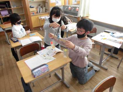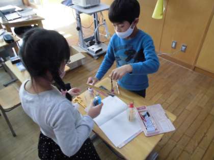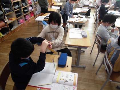 算数の授業では「重さの表し方」について学習しています。今日はてんびんを使って、どちらが重たいのか比べてみました。手で持った感覚では分からないものを目で見て確かめることができて子供たちは楽しみながら学習していました。