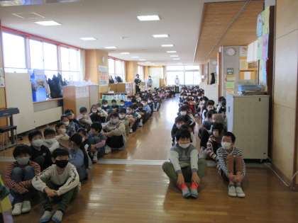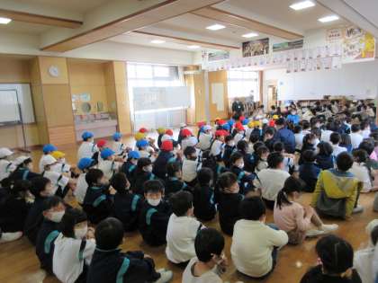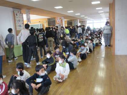 今日は、「震度5の地震発生・津波警報が発令」という想定で、避難訓練をしました。「津波警報が発令されました。全員3階に避難しなさい。」という教頭先生の校内放送を聞いて、子供たちは、静かに3階へと移動開始。先生の指示や校内放送を正しく聞いて、速やかに避難することができました。