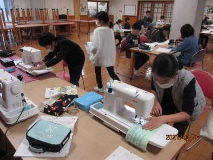 家庭科の学習では、ミシンの練習中です。練習布を使って、ミシンを使う練習をしました。どの子供も真剣に、慎重に取り組んでいました。