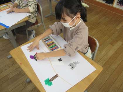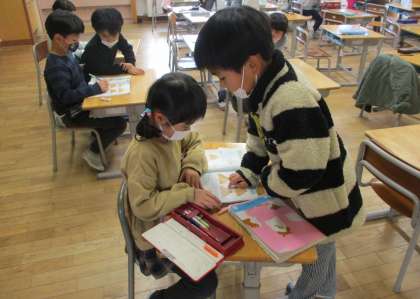 外はだんだん寒くなっていますが、子供たちは寒さに負けず、元気いっぱい学習しています。写真は、図工でお話の絵を描いている様子、国語で友達から聞いたお話を班のみんなに伝えている様子、算数でお友達に教えている様子です。