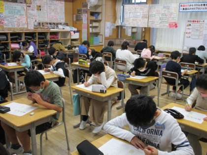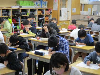 学習のたしかめテストの期間が始まりました。1日目は社会です。テスト前には、教科書や資料集などを見直したり、友達と問題を出し合ったりしていました。明日は国語です。頑張りましょう!