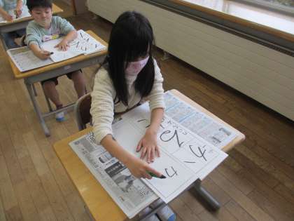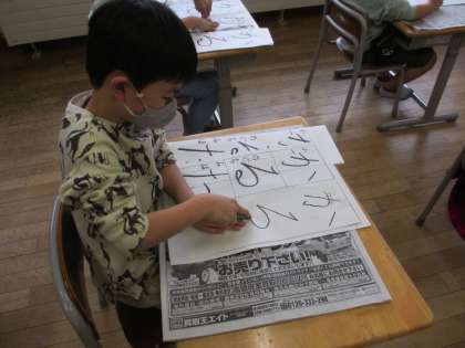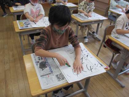 1年生は、書き初めの練習を始めました。初めて使う硬筆墨で、姿勢よく一生懸命書いていました。書き慣れない硬筆墨でしたが、一字一字丁寧に書く姿がとても立派でした。