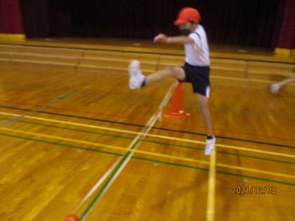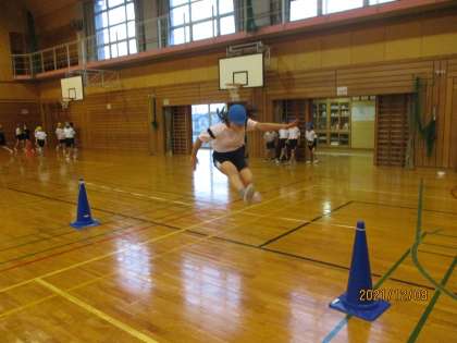 体育の学習では、走り高跳びに挑戦しています。ハードル走とは違い、体を横に向けたり上に跳んだりするため、高く跳ぶための体の使い方を練習しています。