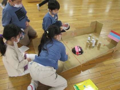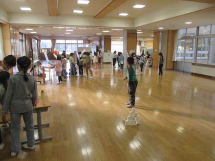ゴムロケットや、かさぶくろロケット、コトコト車など、自分たちのおもちゃを紹介したり、1年生に遊び方を説明したりと大忙し。でも1年生が楽しんでくれたら、自分たちも嬉しいと感じながら、一生懸命に頑張りました。