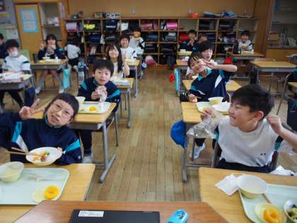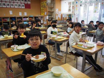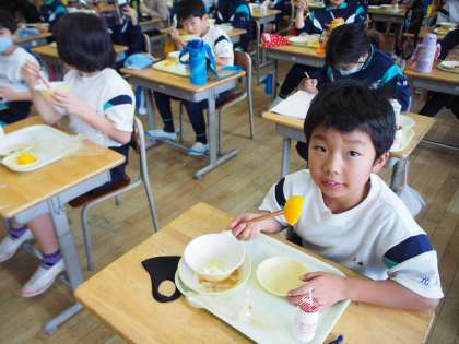 今日は、光陽夢ランチでした。子供たちは、揚げパンや桃をおいしそうに食べていました。