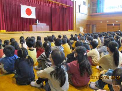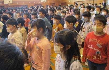 本日、終業式がありました。1年生は、入学してから初めて、全校で体育館に集まっての式でした。終業式の後には冬休みについての話があり、全てあわせて20分ほどありましたが、最後まで良い姿勢で話を聞くことができました。また、一生懸命覚えた大好きな校歌も、自信満々に歌っていました。