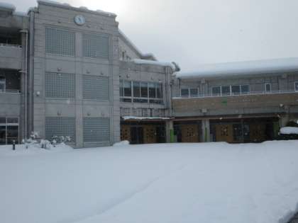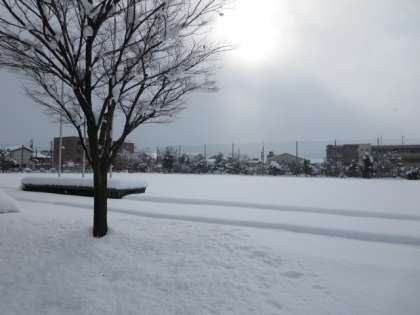 25日夜から降り続いた雪で、校舎もグラウンドもすっかり雪景色となりました。冬休みに入っているので、元気な子供たちの声を聞くことはできず、辺りはしーんと静まりかえっています。