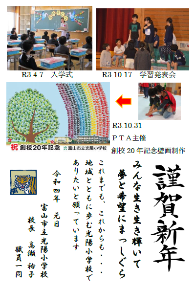 今年も、光陽っ子のみんなが生き生き輝いて 夢と希望にまっしぐらで過ごせるように教職員一同頑張ります。地域の皆様、保護者の皆様、ご協力、ご支援をよろしくお願いします。