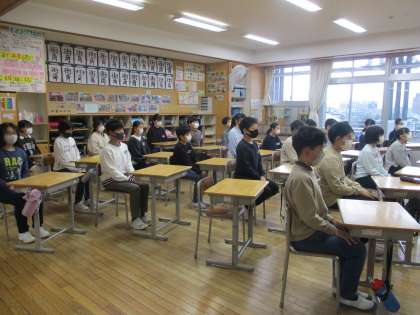 今日の始業式は、校内放送で行われました。話している人の姿が見えなくても背筋をぴんと伸ばして話を聞く姿は、さすが6年生!大変立派でした。