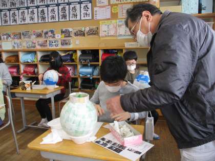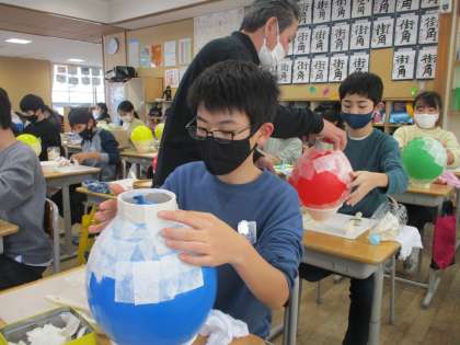 1回目の今日は、風船にのりを付けた和紙を貼り付ける「下貼り」を行いました。四角形の形の和紙を、どのように風船に貼り重ねたらよいか考え、もくもくと作業していました。