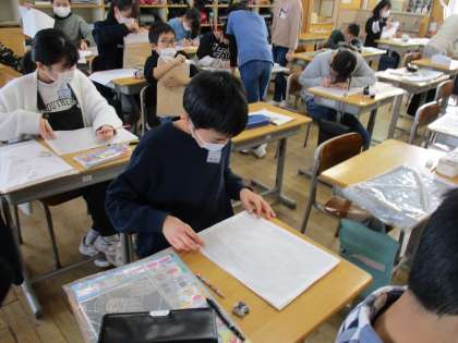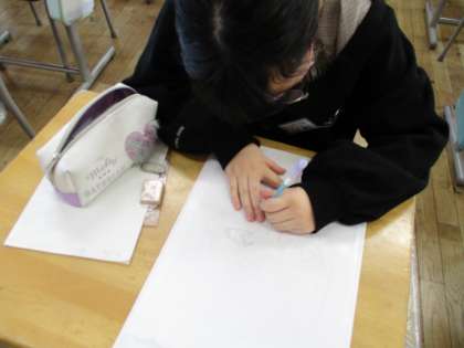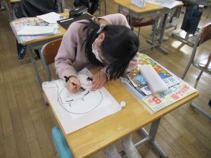 図画工作科の学習では、自分の顔を題材にして、版画の作品をつくります。力をこめている自分、友達と話して笑っている自分、真剣に読書している自分・・・。色々な自分の表情を見つめて下書きをしている姿がみられました。