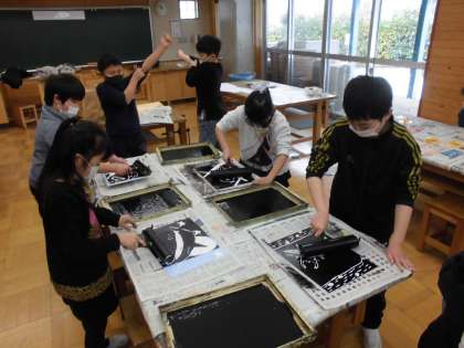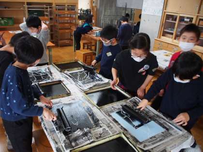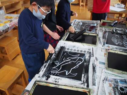今日の図工の時間に版画をすりました。子供たちは、うまくいくかなとドキドキしながら紙に刷っていました。一人一人が心を込めて、とても上手に仕上がっていました。