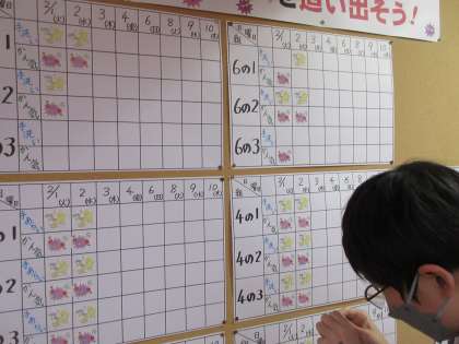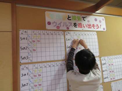 新型コロナウイルス感染症の予防策を保健委員会が、全校の学級に呼びかけています。学級毎の達成度表にシールを貼る6年生に聞いたのですが、このシールも保健委員の手づくりだそうです。コロナ禍にも負けず、保健委員で工夫を凝らし、役割もしっかりと果たしていますね。