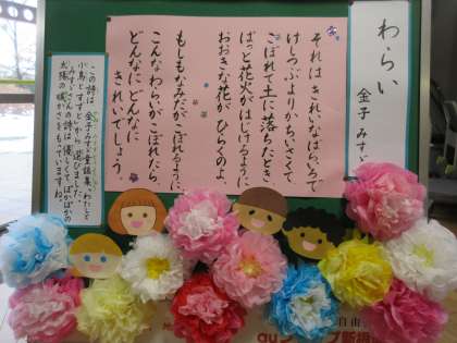 「わらい」がこぼれて、花火のような花が開く様子を思い浮かべると、元気が出てきます。金子みすゞさんの優しくて心がぽかぽかする詩を 子供たちにも口ずさんでもらいたいと思います。