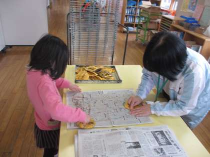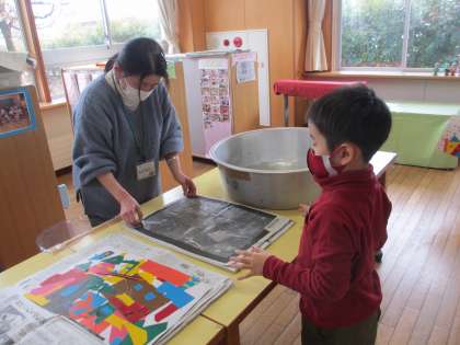いよいよその作品を刷りました。力強くばれんを使って押すことができたので、きれいに色が出ました。素敵な作品に仕上がって、嬉しいですね。
