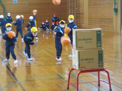 本日から、体育では「ボール投げ運動」を行っています。2学期にもボールを投げる練習をしました。上手な投げ方を覚えているかな?と段ボールの的をねらってボールを投げました。バンバン当てることができ、楽しく運動することができました。