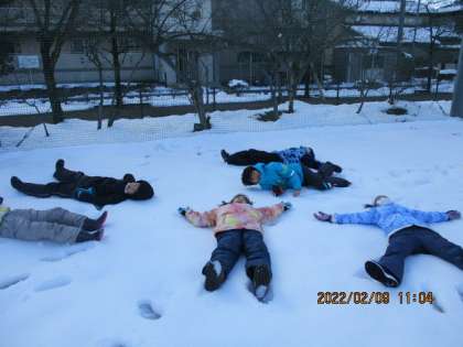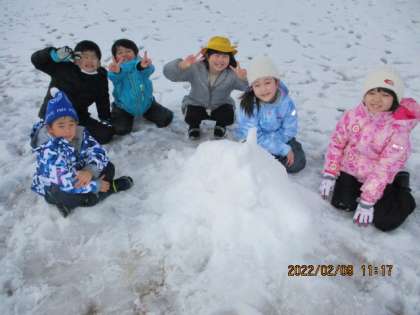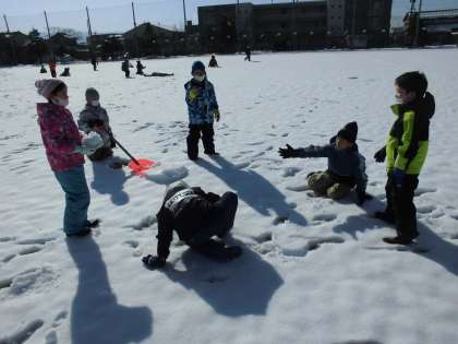 雪が少し溶けてしまっていたけれども、外に出て雪遊びをしました。少ない雪をかき集めて雪だるまを作ったり、雪玉を投げたりして目一杯体を動かして遊んだ子供たちでした。
