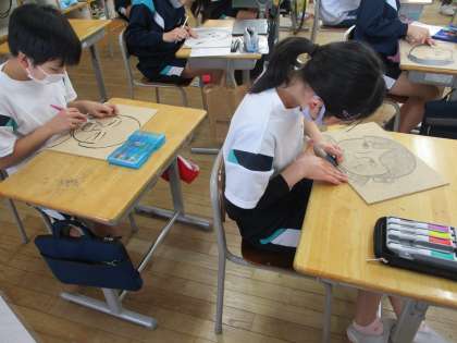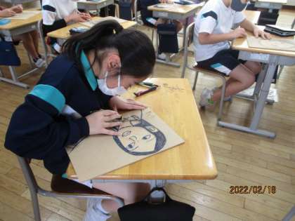 頬の丸みが出るように、彫る方向を工夫しながら一生懸命彫っています。