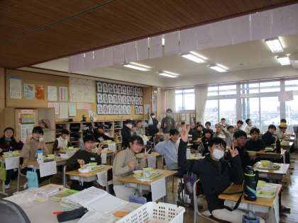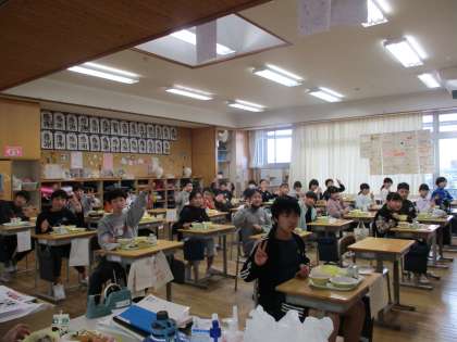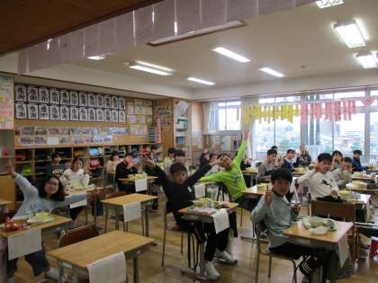 「卒業お祝い献立」でした!赤飯やとんかつ、紅白 白玉汁、豆乳プリンタルトという、豪華メニューでした。子供たちは、おかわりもたくさんして、美味しく味わって食べていました。写真からは子供達の「美味しい〜!」という声が聞こえてきそうですが、感染症対策のため、黙食もしっかり守っています。