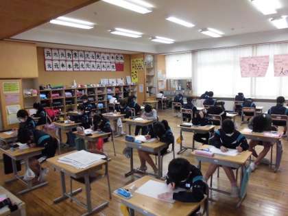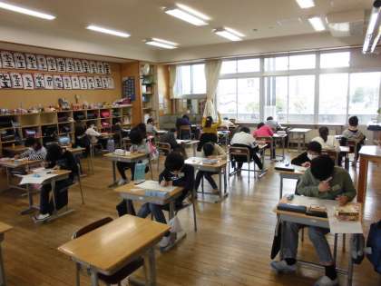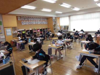 今日は算数の学習のたしかめテストを行いました。計算間違いがないか何度も解き直したり、図形の問題ではコンパスをうまく使って作図したり、丁寧に問題に取り組む子供たちでした。