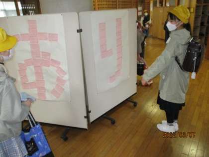 一つ目は「6年生へのありがとうメッセージ」です。全校から6年生へのメッセージを募集したところ、たくさん集まりました。メッセージカードは玄関に掲示し、一部を放送で紹介しました。
