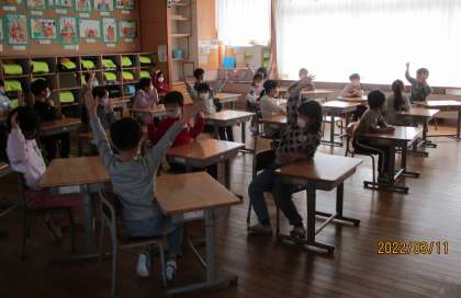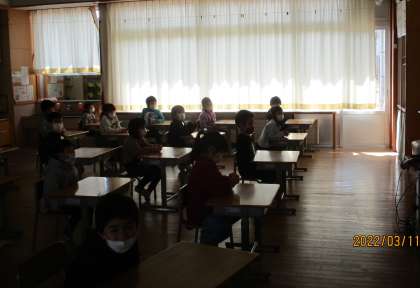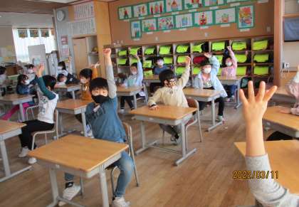 1年生は、クイズの答えを指で示して参加したり動画を夢中になって見たりしていました。