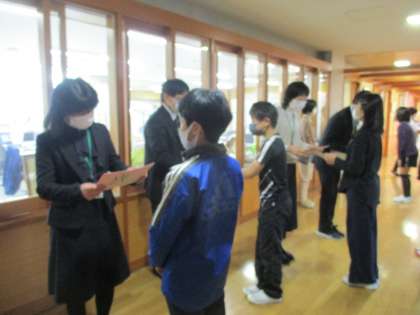 今日は「感謝プロジェクト」のメンバーが、先生方への感謝の気持ちを込めて作ってきたメッセージカードを渡しに行きました。先生方からたくさんの応援の言葉をいただき、嬉しそうな子供たちでした。