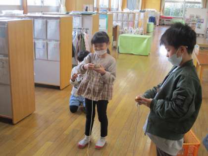 1年生は、生活科で「むかしのあそび名人」をめざして、けん玉やお手玉、竹とんぼなどの遊びをしています。距離を取りながら「こうしたら上手くいくよ」と友達に名人になるコツを教えてもらったり、何度も何度も挑戦してできるようになったりして、楽しんで活動していました。