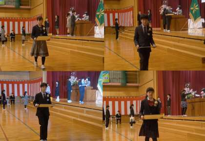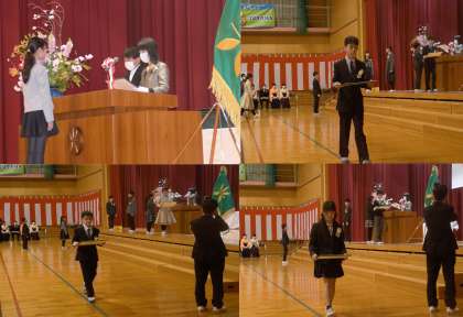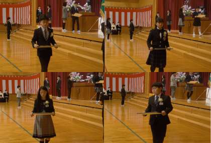 6年間の頑張りの証である「卒業証書」授与の様子です。校長先生と目を繋ぎ、立派な態度で受け取りました。