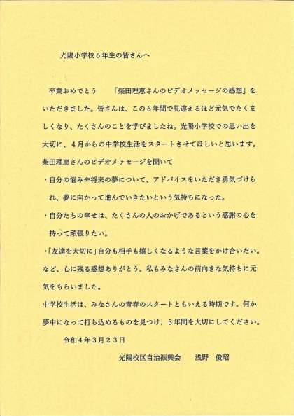 先日、自治振興会の方からいただいた柴田理恵さんのビデオメッセージを視聴した子供たち。その際に書いた感想を、光陽校区自治振興会の皆様に届けたところ、浅野俊昭会長様より、卒業生へメッセージを頂きました。