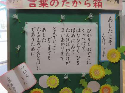 令和4年度が始まって、子供たちの瞳はきらきら輝いています。今週はお天気にも恵まれ、桜も見頃になりました。「今年こそ○○できるようになりたいな」と願いをもってスタートした4月。今月の詩は「あしたこそ」にしました。
