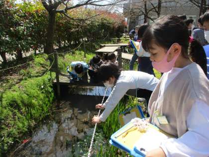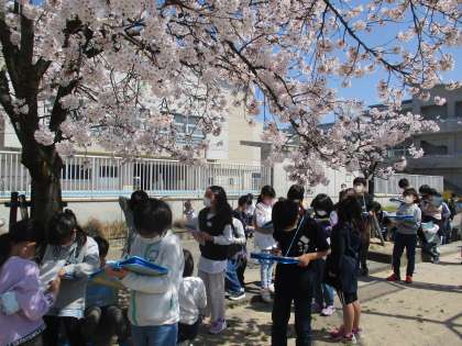 理科の授業でグラウンドに出て、春の生き物や植物を観察しました。子供たちは、ありの巣やイモムシなどを楽しそうに観察していました。