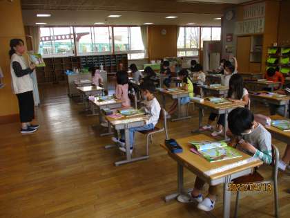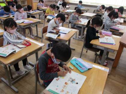 今日から教科書を使っての学習が始まりました。「いいてんき」を音読したり、教科書の絵から見付けたことを発表したりしました。また、正しい鉛筆の持ち方の練習も行いました。