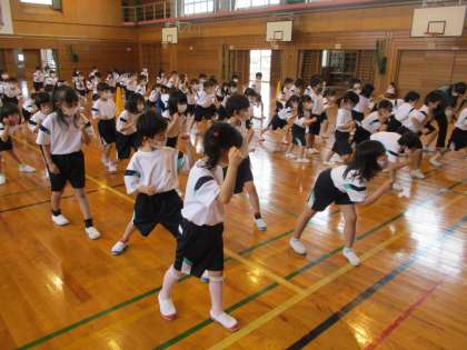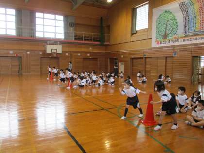 今日は、雨が降っていたので、体育館で走り出しの姿勢を練習しました。先生の「よーい!」の声に合わせて、何度も練習しました。