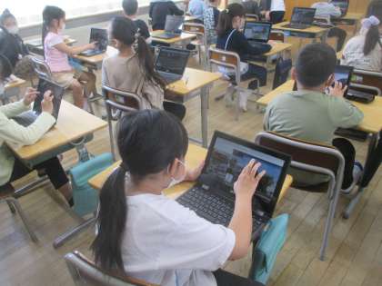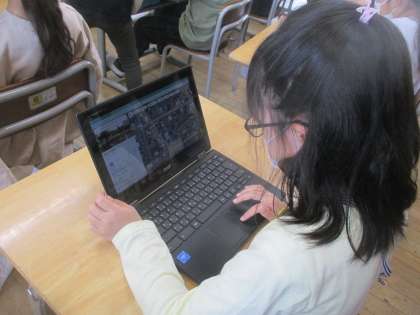 社会科の学習で、クロームブックを使って学校の周りの様子を調べました。ストリートビューの機能を使うことで、実際に町を歩いているようにいろいろな施設やお店を見付けることができ、子どもたちは楽しく取り組んでいました。