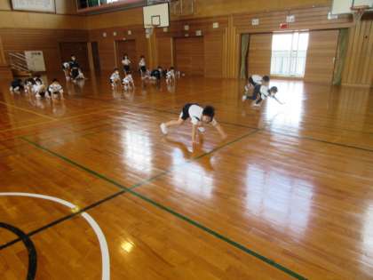 今日の体育は、動物歩きやカラーコーンの周りをぐるぐる回るリレー等をしました。子供たちは普段使わない筋肉を使いながらの運動になり、とても楽しみながら体を動かしていました。