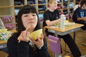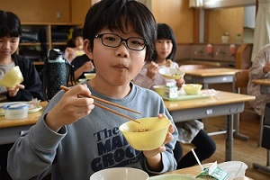 給食の時間、嬉しそうに給食を頬張る子供たち。