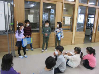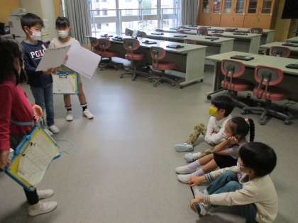 今日は、2年生に学校を案内してもらいました。校長室や理科室、コンピュータ室等、初めて行く場所もたくさんありましたね。探検やクイズを通して色々なことを知った子供たちは、戻ってきてから発見したことをたくさん話していました。
