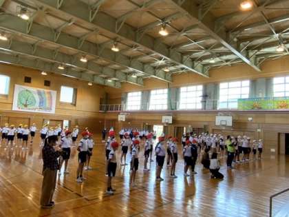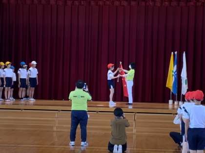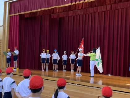 結団式を行いました。校長先生から各団長に団旗を託しました。これから運動会に向けて心を一つにして取り組んでいきましょうね。この日は6年生だけが体育館に集まり、それ以外の学年の子供たちは教室でオンラインで参加しています。