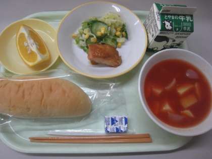 コッペパン、照り焼きチキン、コールスローサラダ、ミネストローネ、ポケットチーズ、甘夏みかん、牛乳