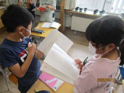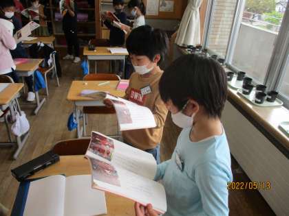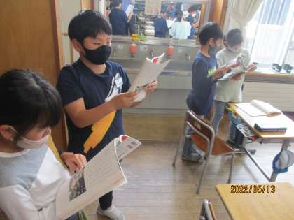「アップとルーズで伝える」の学習をしています。筆者が言いたいことが何なのか見つけるために音読をしたり話し合ったりしました。子供たちは、一生懸命学習に取り組んでいます。