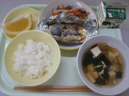 ごはん さばの銀紙焼き 大根の中華きんぴら すまし汁 河内晩柑                      牛乳